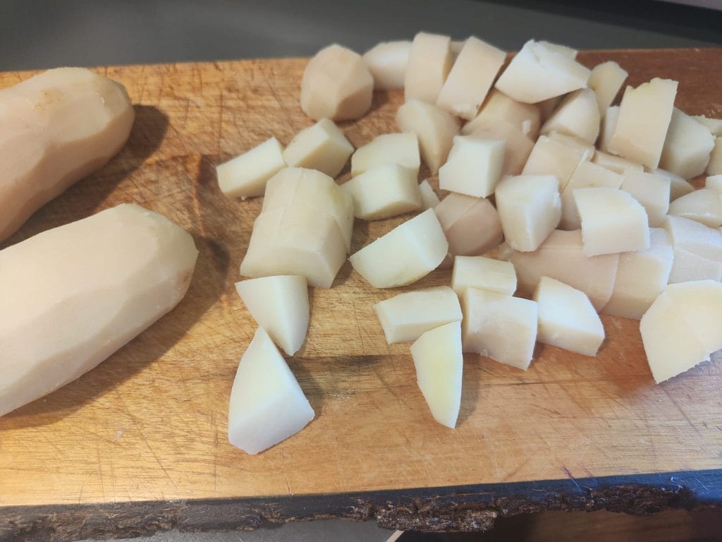 Lorsque les pommes de terre sont cuites, les éplucher et les mettre au réfrigérateur, de cette façon il sera plus simple de couper des cubes réguliers.
