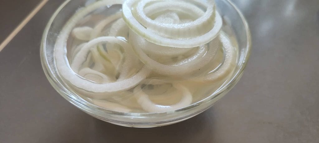 Pour enlever un peu de goût fort à l’oignon, trempez les rondelles d’oignon pendant 30 minutes dans un bol avec de l’eau froide et du vinaigre de vin (blanc ou rouge).