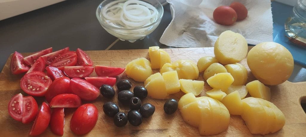Pour vérifier la cuisson des pommes de terre, piquez-les avec les dents d’une fourchette : lorsque la fourchette s’enfonce dans les pommes de terre sans rencontrer de résistance, égouttez les pommes de terre et laissez-les refroidir avant de les peler et de les couper en morceaux.