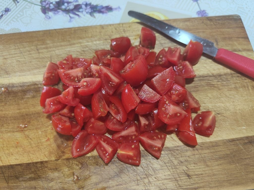 Coupons les tomates cerises en 4 parties et les olives en fines rondelles.