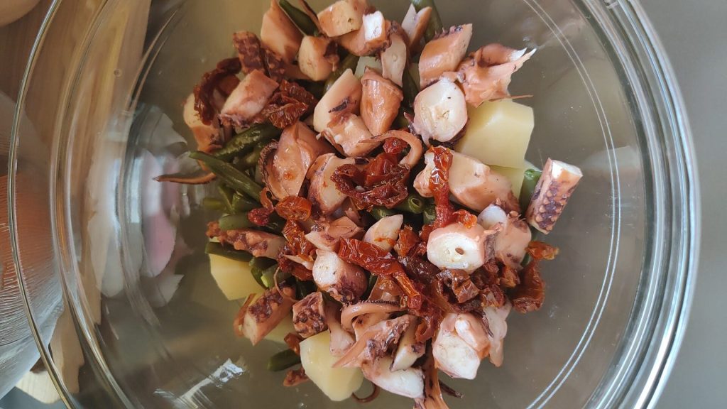 À ce stade, coupez le poulpe en morceaux ou en rondelles et mettez-le dans un saladier, ajoutez les haricots verts et les pommes de terre, assaisonnez avec de l’huile, du sel, du poivre, le céleri finement tranché, les tomates et le jus d’un citron et le zeste râpé.