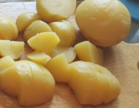 Lorsque les pommes de terre sont complètement refroidies, retirez la peau et coupez-les en morceaux réguliers. Réservez-les dans un récipient couvert de film plastique pour éviter qu’elles ne deviennent noires au contact de l’air.