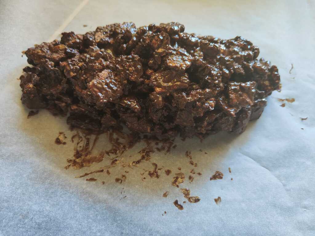 Dans un bol assez grand, mélange le chocolat fondu, l’huile, la noix de coco râpée, la boisson végétale et enfin les biscuits émiettés. Mélange bien.
