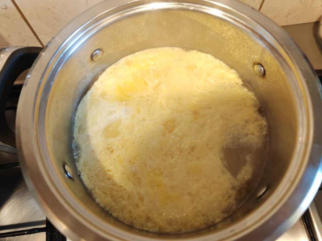 Quand le bouillon commencera à bouillir, versez au centre de la casserole le mélange d’œufs et de parmesan râpé et remuez avec le fouet à main pendant quelques secondes.