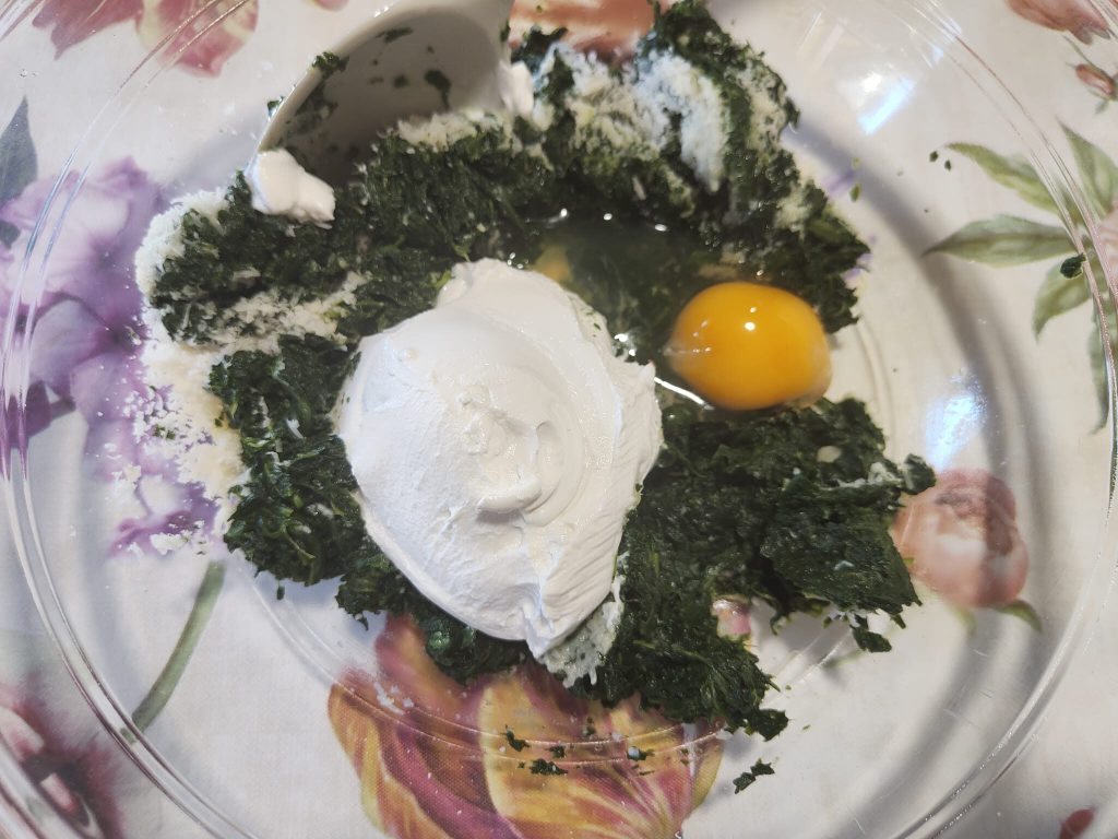 • Dans un bol, mettez les épinards, déjà cuits et égouttés, faites-les revenir à la poêle pour bien sécher l’excès d’eau puis ajoutez la ricotta, l’œuf, le fromage râpé, le sel, la noix de muscade.