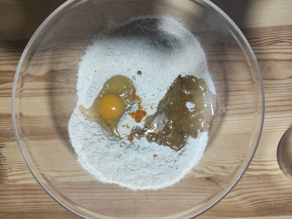 Ajoutez l’œuf, l’huile de tournesol, l’érythritol et la levure chimique.