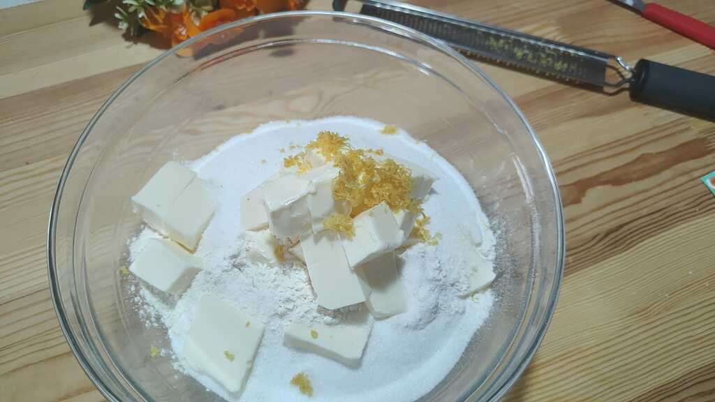 En premier lieu, commencez par le sablage : dans un bol, versez la farine tamisée, le sucre, une pincée de sel et le beurre froid du frigo coupé grossièrement en cubes et le zeste râpé d’un citron.