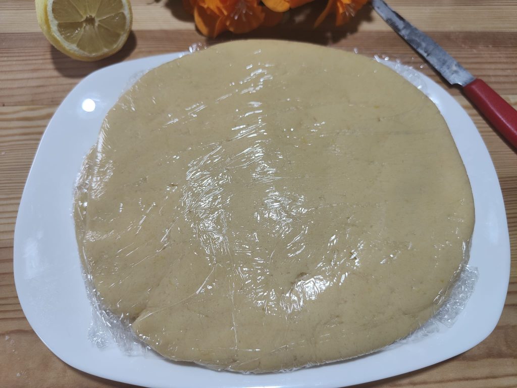 Formez un pâton et enveloppez-le dans du film alimentaire, placez-le au réfrigérateur pour le faire raffermir au moins 30 minutes.