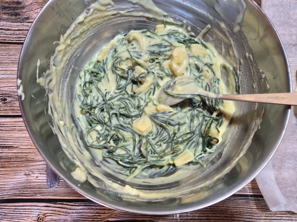 Mélangez rapidement : les petits dés de fromage doivent se répartir partout.