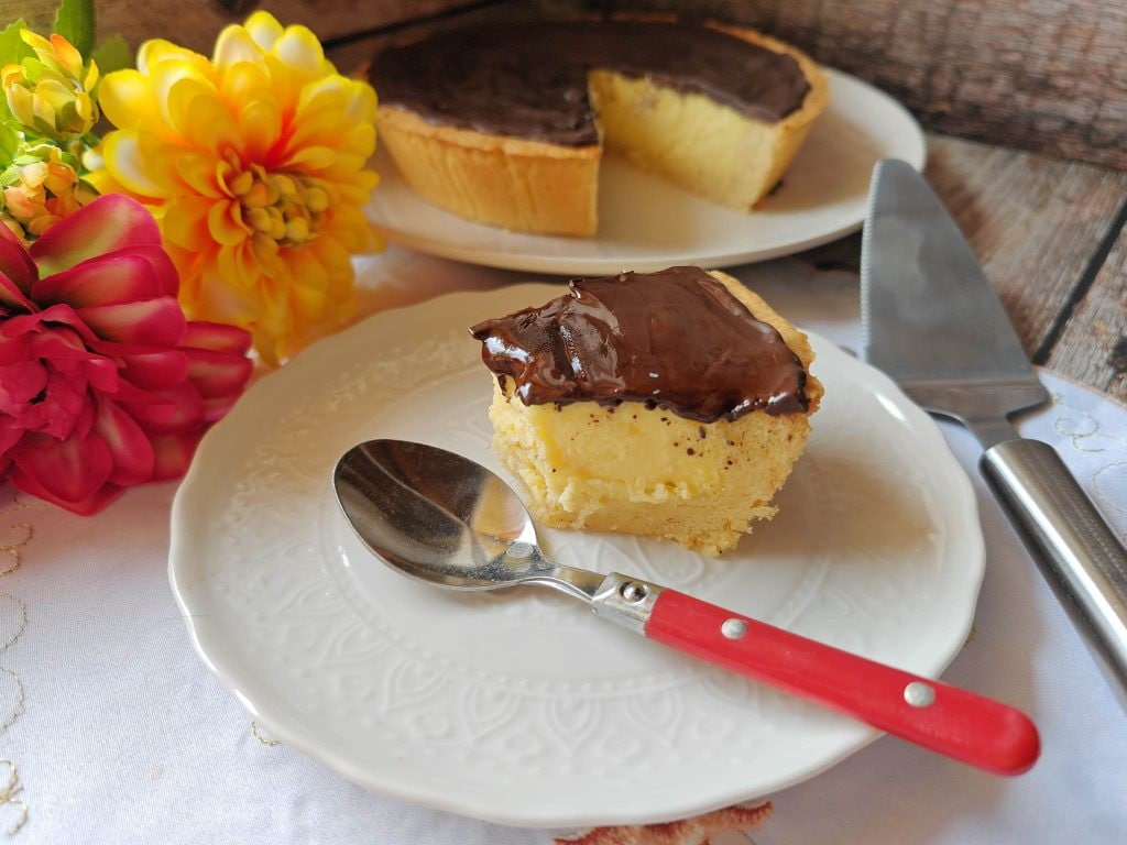 C’est une tarte délicieuse avec une triple texture, une croûte de pâte sablée, une crème blanche et une crème noire en couverture qui rendent la tarte Susanna délicieuse et vraiment gourmande, idéale pour toute occasion, que ce soit pour le goûter ou le petit déjeuner.