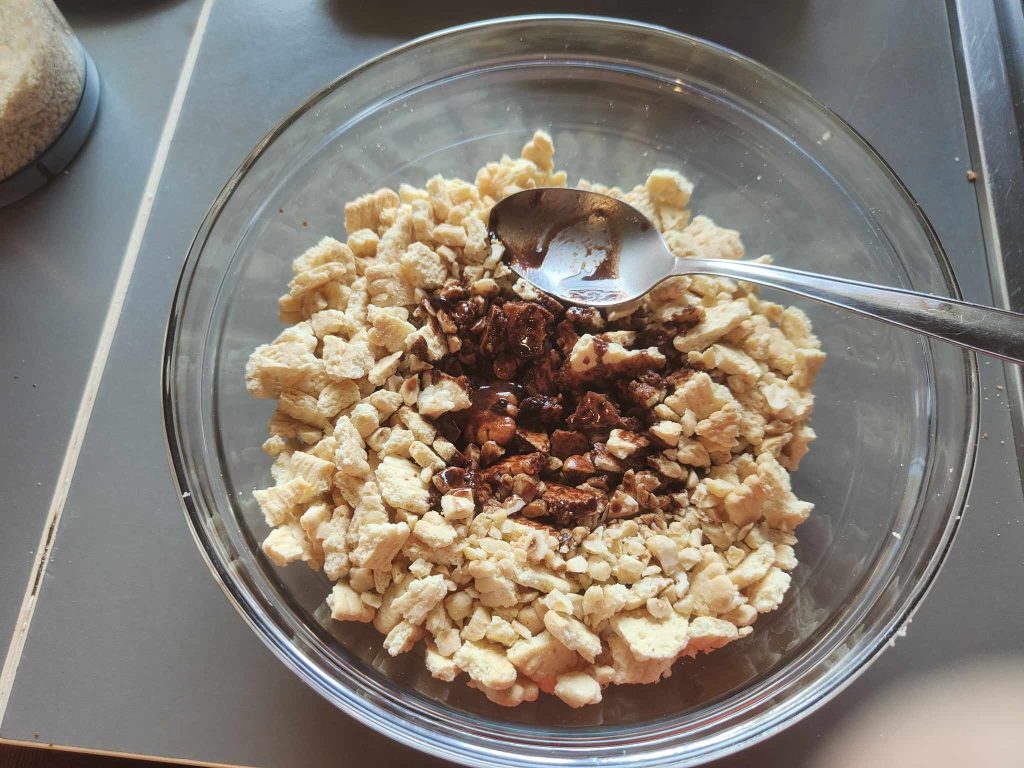 Dans un bol assez grand, mélange le chocolat fondu, l’huile, la noix de coco râpée, la boisson végétale et enfin les biscuits émiettés.