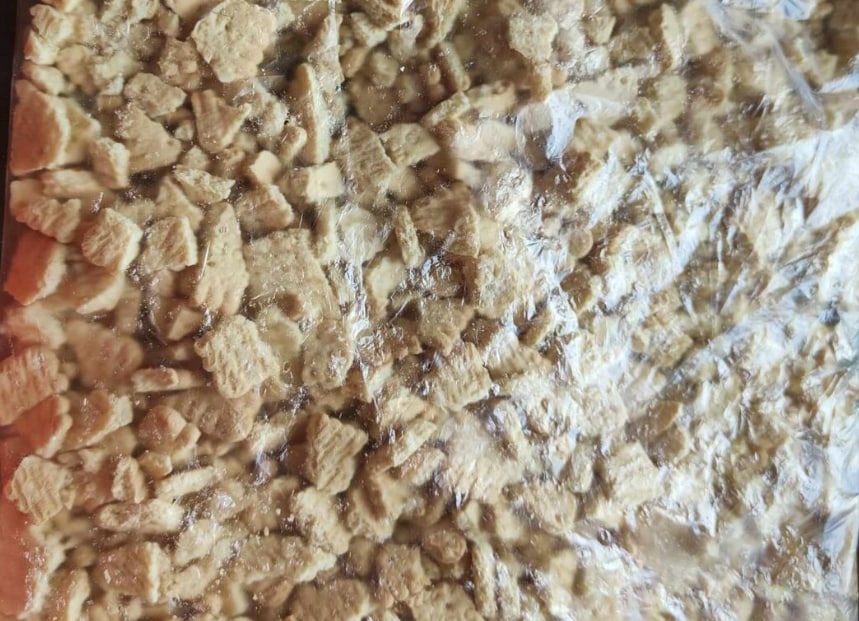 (Généralement, j’utilise le fond d’un verre, mais sur du papier sulfurisé avec un rouleau à pâtisserie ou dans un sac de congélation, ça marche aussi).