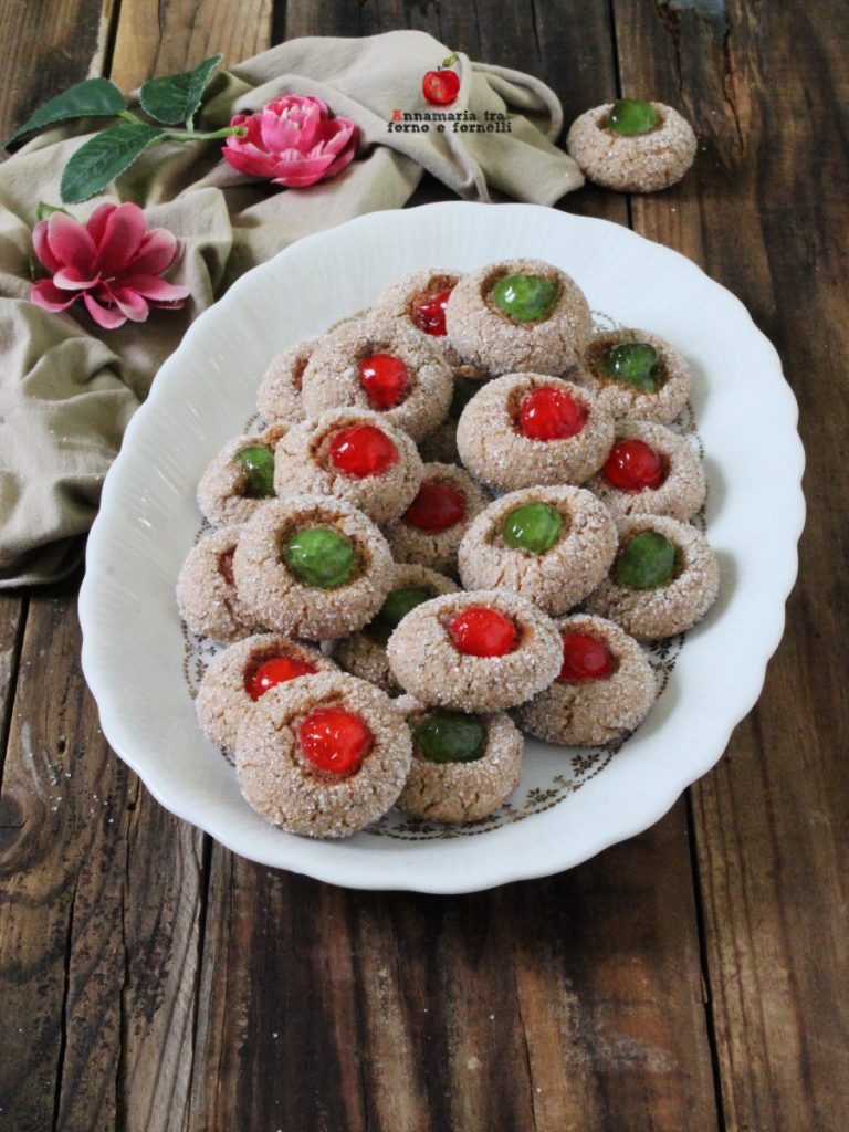 J’adore les desserts aux fruits secs, qu’ils soient avec des amandes, des noisettes ou des pistaches, je les trouve paradisiaques. Et c’est exactement ainsi que sont les biscuits aux amandes et cerises confites: adorables, faciles à réaliser, très gourmands et ils se conservent pendant plusieurs jours. Ils sont excellents à déguster seuls ou en compagnie, en savourant un café ou un thé, entre une conversation et une autre. Enveloppés dans du papier transparent et noués, ils peuvent être une idée cadeau appréciée. Pour les rendre encore plus gourmands, les petits gâteaux aux amandes avec cerises confites peuvent être encore enrichis en ajoutant une pincée de cannelle à la pâte. Le parfum enivrant qu’ils dégageront pendant la cuisson vous séduira sûrement. Croquants juste sortis du four, le lendemain ils deviendront moelleux et, dans un cas comme dans l’autre, ils réussiront à tenter le palais de ceux qui les dégusteront.