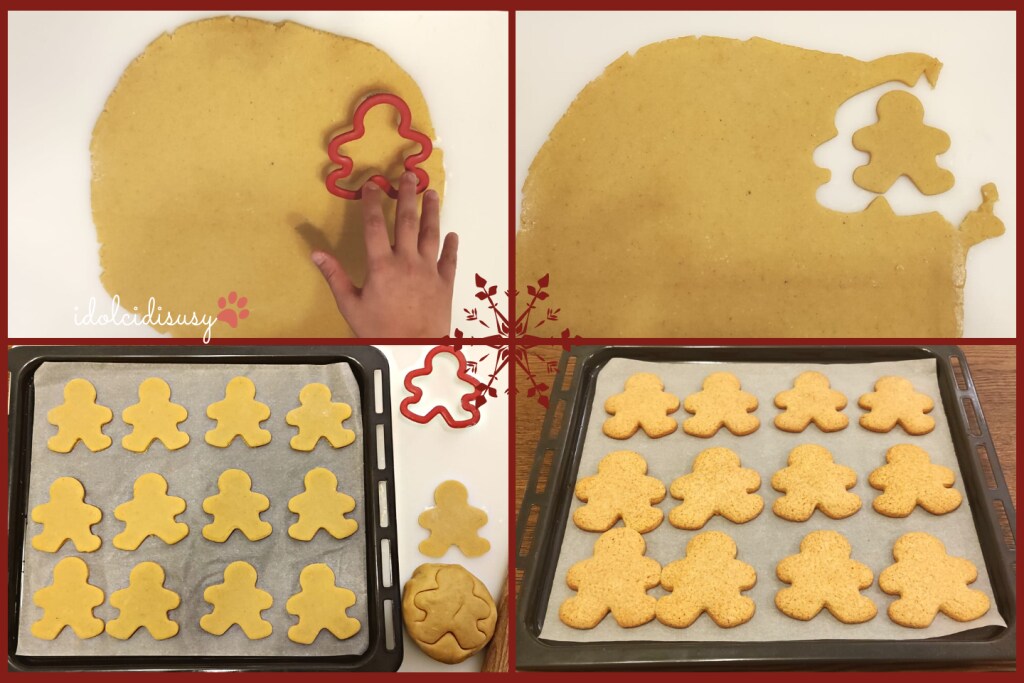 La pâte de pain d’épices doit avoir une épaisseur de 5 mm, puis, avec des emporte-pièces en forme de petit bonhomme, je crée les biscuits et les place sur une plaque recouverte de papier sulfurisé. Enfin, je les mets au four à 170° pendant 15 minutes, puis je les laisse bien refroidir et enfin je les décore avec le glaçage royal