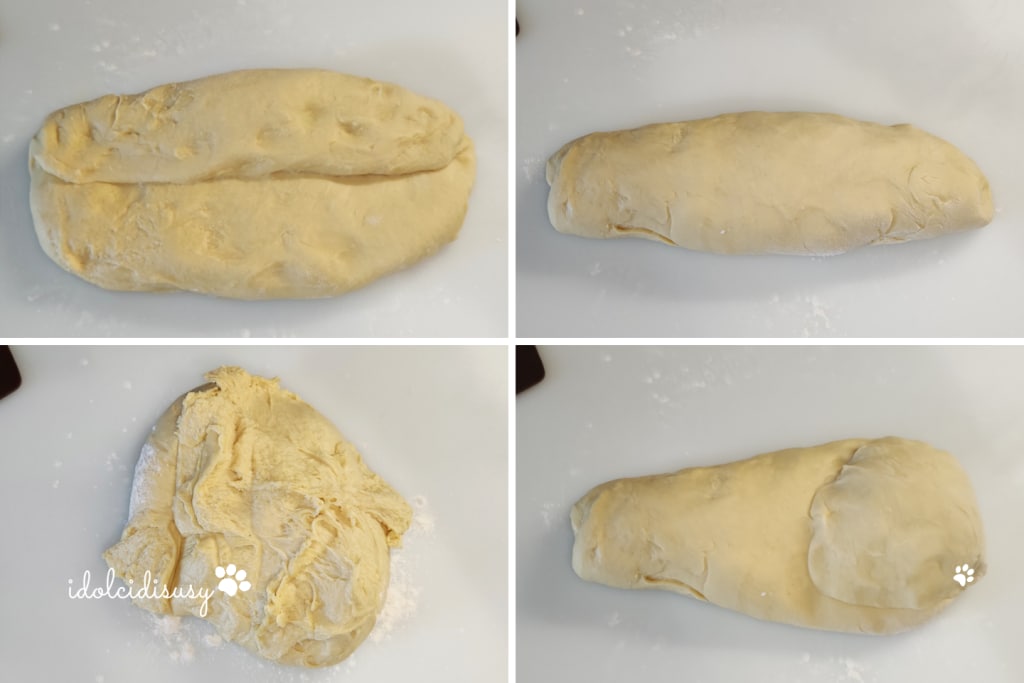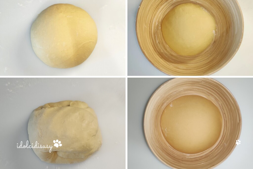 Je procède avec les plis pour donner de la force à la pâte, je l’étends avec les mains en créant un rectangle, je plie la pâte en portefeuille d’abord le côté supérieur puis l’inférieur, puis le côté droit et enfin celui de gauche pour créer la boule classique. Je la mets dans un bol fermé dans le four pour lever jusqu’au double, cela prendra 5/6 heures.