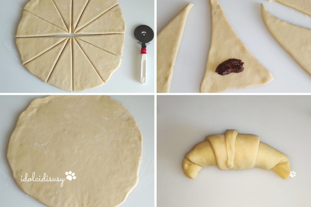 Après la levée, j’étends la pâte sur la planche avec le rouleau pour lui donner la forme d’un cercle, avec le coupe-pâte je crée 12 triangles. Sur le côté le plus large, je mets une cuillère de Nutella et je roule la pâte pour créer la forme de la brioche classique.