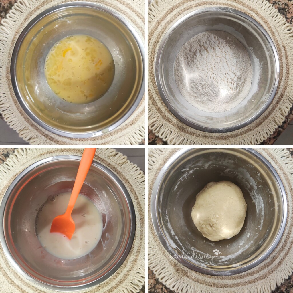 Je coupe au centre chaque morceau en laissant les bords intacts et je fais passer un bord 3 fois à l’intérieur d’une seule partie. Je mets les brioches tressées sur la plaque recouverte de papier sulfurisé.