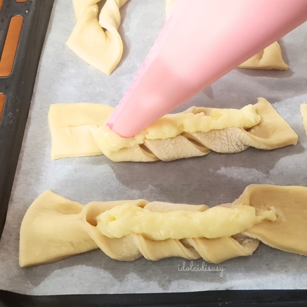 Les brioches tressées à la crème pâtissière, un vrai délice pour le palais, une recette parfaite pour le petit-déjeuner du matin. Très faciles à faire, dans le procédé je t’explique avec des photos étape par étape la méthode pour faire le tressage, donc tu dois absolument les faire. Elles plaisent à tout le monde, petits et grands, comme une tranche de gâteau classique ou de gâteau aux pommes parfumé et ensuite tu peux les faire à la main sans pétrin ou robot de cuisine, il suffit juste d’un peu de patience pour les levées, préparer une délicieuse crème pâtissière, faire le tressage et enfourner nos brioches tressées à la crème.