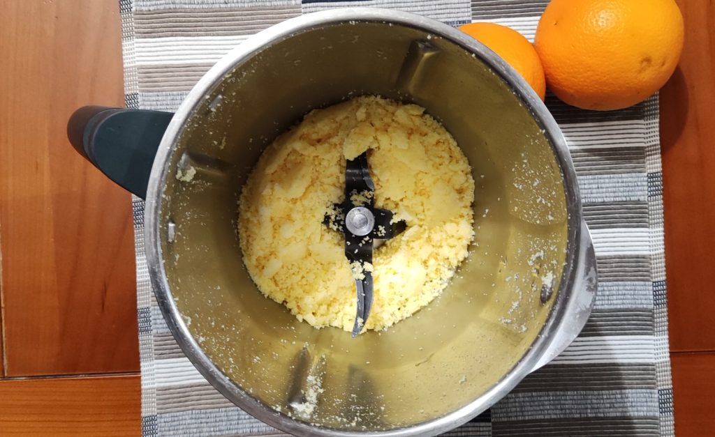 Je mets dans le bol le sucre et le zeste d’orange, j’active le Thermomix pendant 10 secondes à vitesse 7, j’ouvre le couvercle et avec une spatule je racle bien vers le fond.
