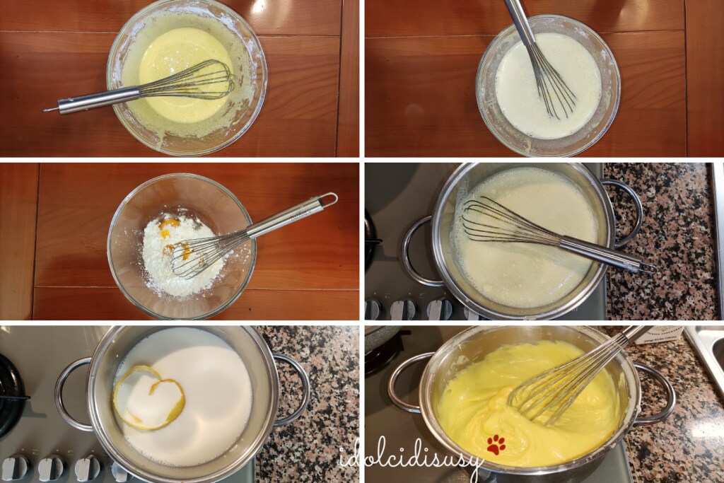 Je verse le lait dans une casserole antiadhésive avec le zeste d’un citron non traité à feu doux. Dans un bol, je mets le sucre, les jaunes d’œufs et l’amidon de maïs tamisé, je mélange bien avec un fouet pour bien tout amalgamer. Quand le lait est bien chaud, j’enlève le zeste du citron et je le verse dans le bol des jaunes, je mélange pour bien amalgamer et je transfère le tout dans la casserole.
