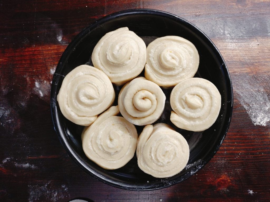 Je les place espacées les unes des autres dans un moule à charnière de 22 cm beurré et fariné et je laisse lever pendant une autre heure.