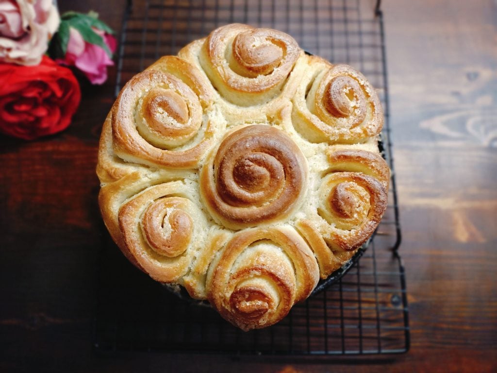 Le gâteau des roses, également appelé gâteau Mantovana, est une brioche moelleuse, farcie d’une riche et parfumée crème au beurre, sucre et vanille. Il tire son nom de sa forme, en effet, il est composé de plusieurs petits rouleaux de pâte qui ressemblent à des boutons de rose, placés dans le moule l’un à côté de l’autre une fois cuits créeront un magnifique bouquet de roses.