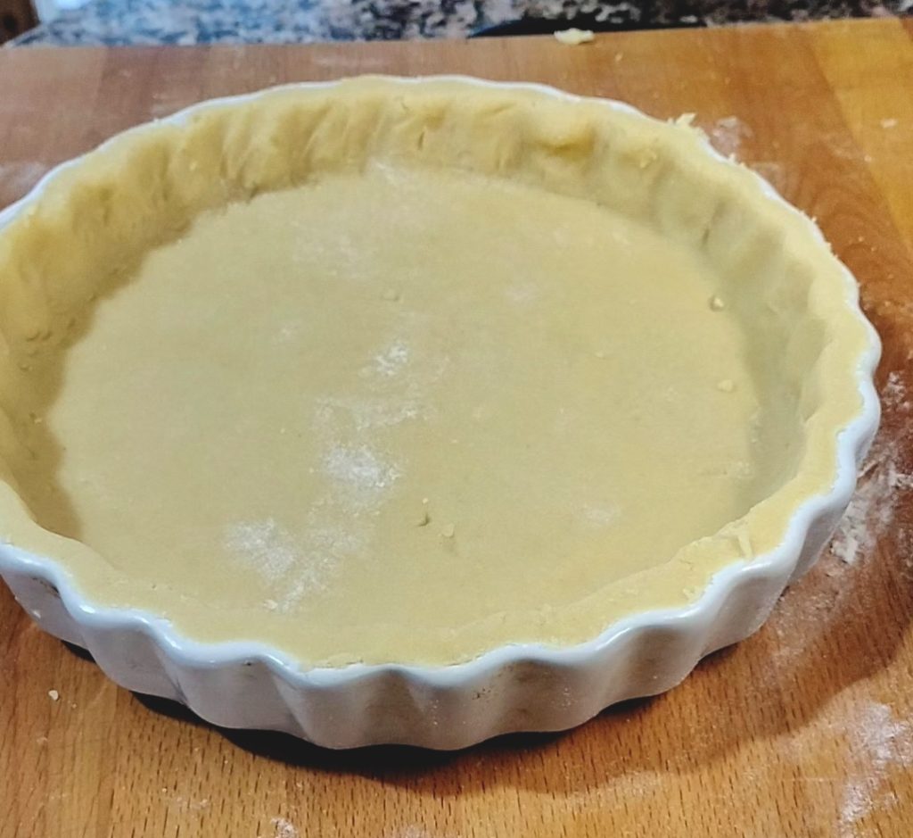 Je reprends la pâte sablée et la déroule sur le plan de travail légèrement fariné. Je la dispose dans un moule beurré et fariné, je fais bien adhérer aux bords et je pique le fond avec une fourchette.