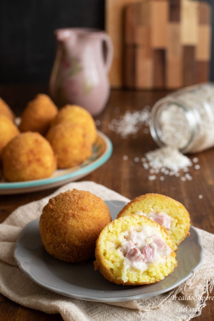 Laissez reposer le riz au moins 6 heures : pendant ce temps il sèchera et refroidira et sera prêt à l’emploi. Cette étape est fondamentale pour obtenir des arancine qui se compacteront bien et ne se casseront pas à la cuisson.