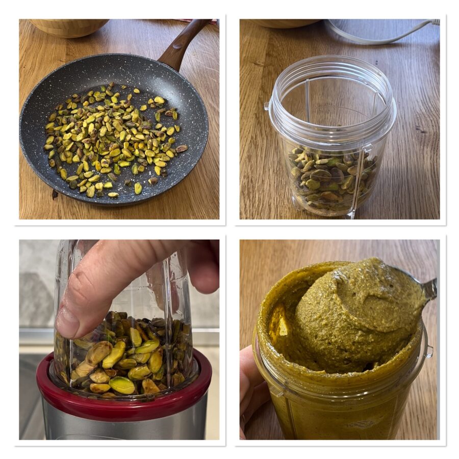 Mettez dans le bol du mixeur les pistaches entières (ou une quantité équivalente d’éclats de pistache) légèrement torréfiées à la poêle et mixez-les avec l’huile, jusqu’à obtenir une crème aussi lisse que possible. Le résultat dépendra beaucoup du mixeur utilisé, mais ne vous inquiétez pas : quelle que soit la consistance, le pesto sera délicieux.