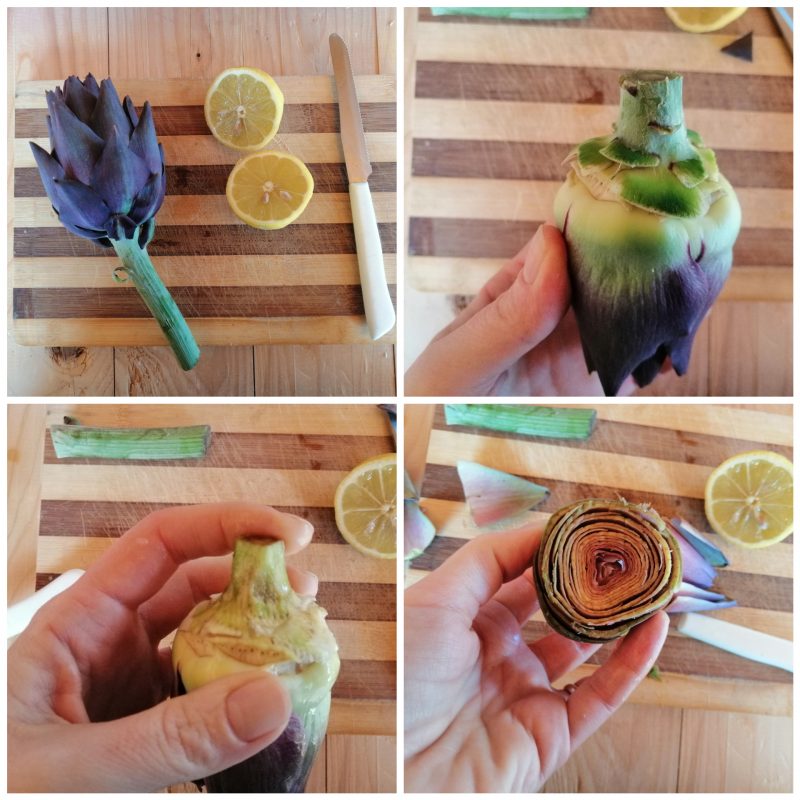 Au fur et à mesure, humidifiez souvent vos mains avec du jus de citron pour éviter qu’ils ne noircissent et gardez les artichauts déjà nettoyés en trempage dans de l’eau légèrement acidulée (utilisez le jus d’un demi-citron par litre d’eau).