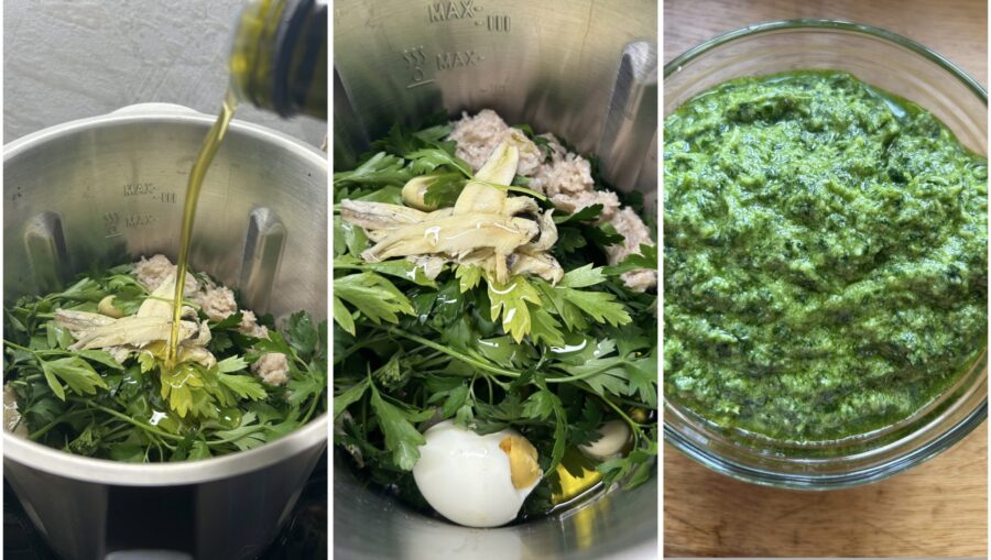 ajoutez le sel si les anchois sont à l’huile et l’huile d’olive. Mixez le tout jusqu’à obtenir une préparation homogène et le bagnetto vert est prêt à accompagner tous vos bolliti. Beaucoup d’entre vous feront la grimace en lisant cette étape, car en réalité le bagnetto vert se hache à la main avec la mezzaluna ; donc si vous voulez rester fidèles à la recette, armez-vous de patience et hachez tout avec l’outil approprié.