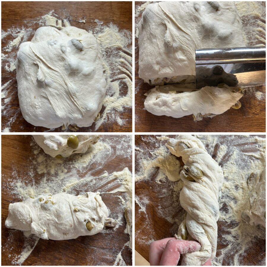 • Repliez la pâte pour envelopper les olives à l’intérieur. Formez une boule et placez-la dans un bol, au chaud, jusqu’à ce qu’elle ait doublé de volume. Laissez-lui entre deux et trois heures si il fait froid, mais seulement une heure s’il fait chaud : la pâte doit avoir doublé. Retournez-la ensuite sur un plan fariné et reformez une boule grossière.