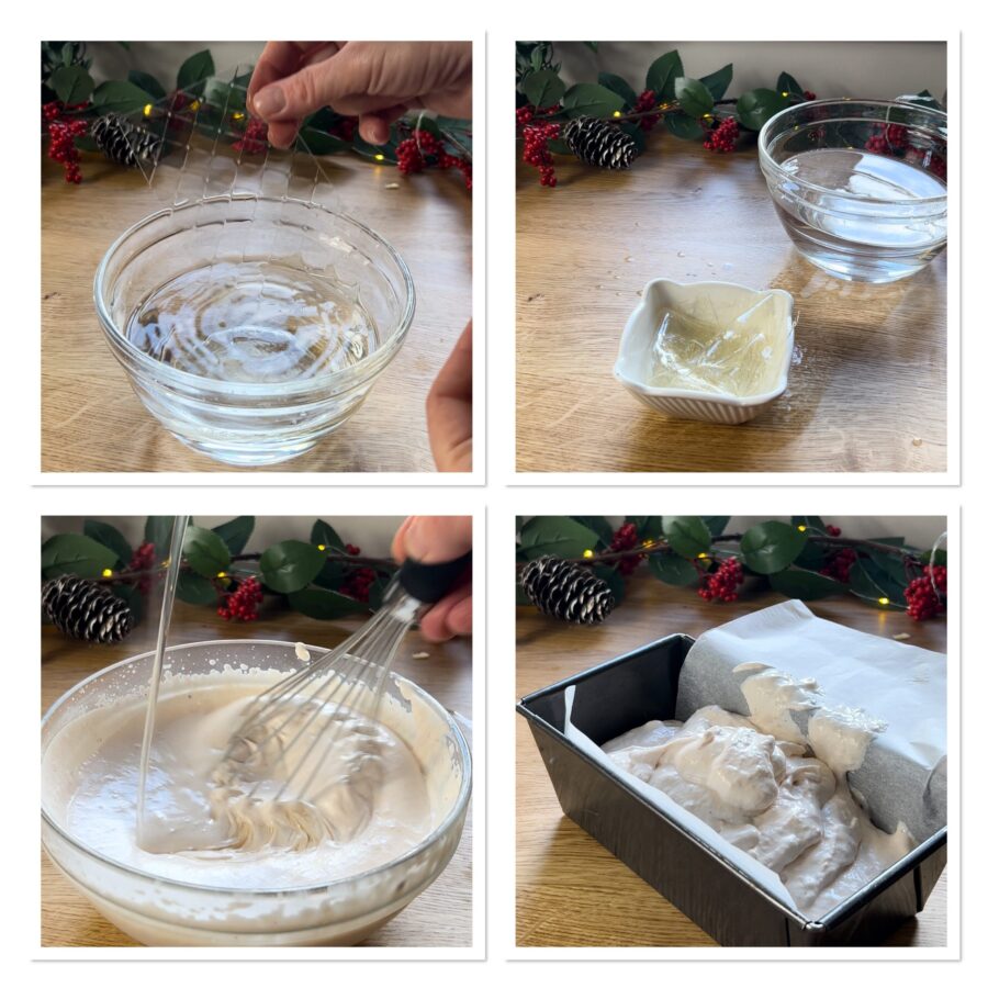 Faites ramollir les feuilles de gélatine dans de l’eau froide pendant quelques minutes ; une fois molles, récupérez-les dans un bol et, sans les essorer, chauffez-les quelques secondes au micro-ondes ou au bain-marie.