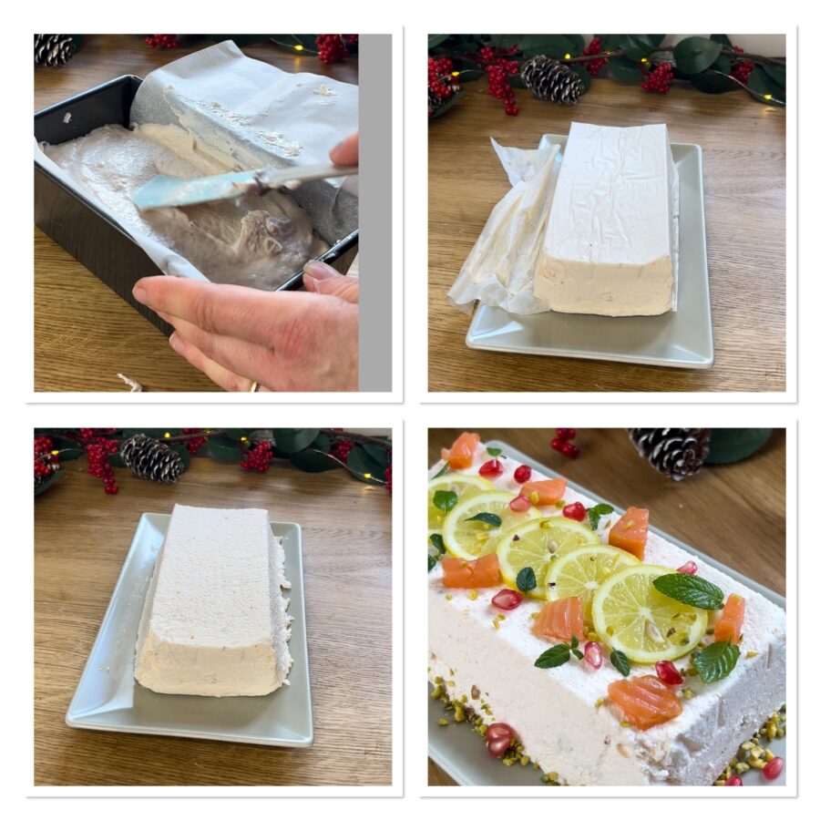 Démoulez délicatement sur une assiette et retirez le papier sulfurisé (si vous avez utilisé un moule en silicone, plongez-le quelques secondes dans de l’eau un peu plus tiède que tiède). Décorez avec des tranches de citron, du saumon fumé, des pistaches concassées, des feuilles de menthe et des arilles de grenade pour un peu de couleur, puis servez.