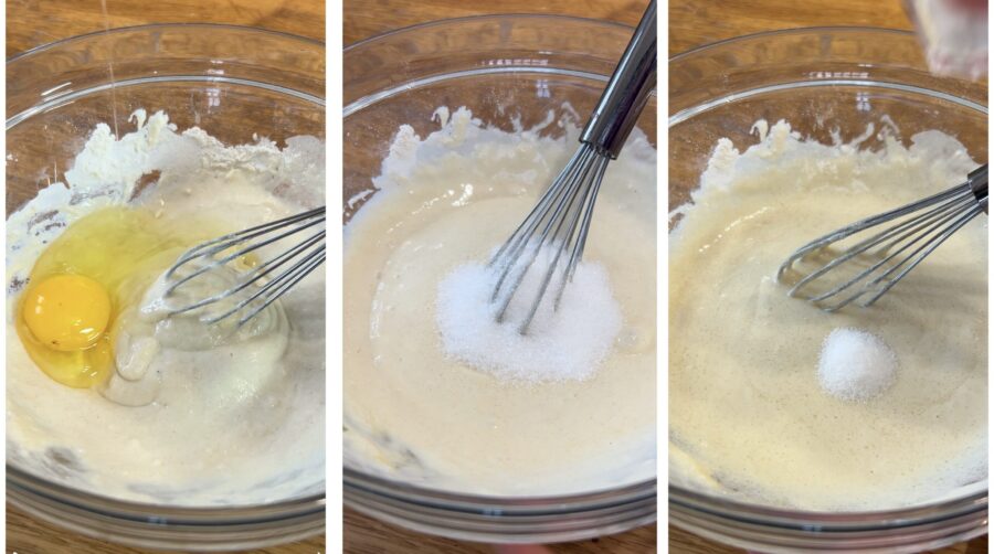 Ajoutez l’œuf, mélangez et ensuite incorporez le sucre et la vanilline ou l’extrait de vanille (ou comme moi un peu de sucre vanillé),