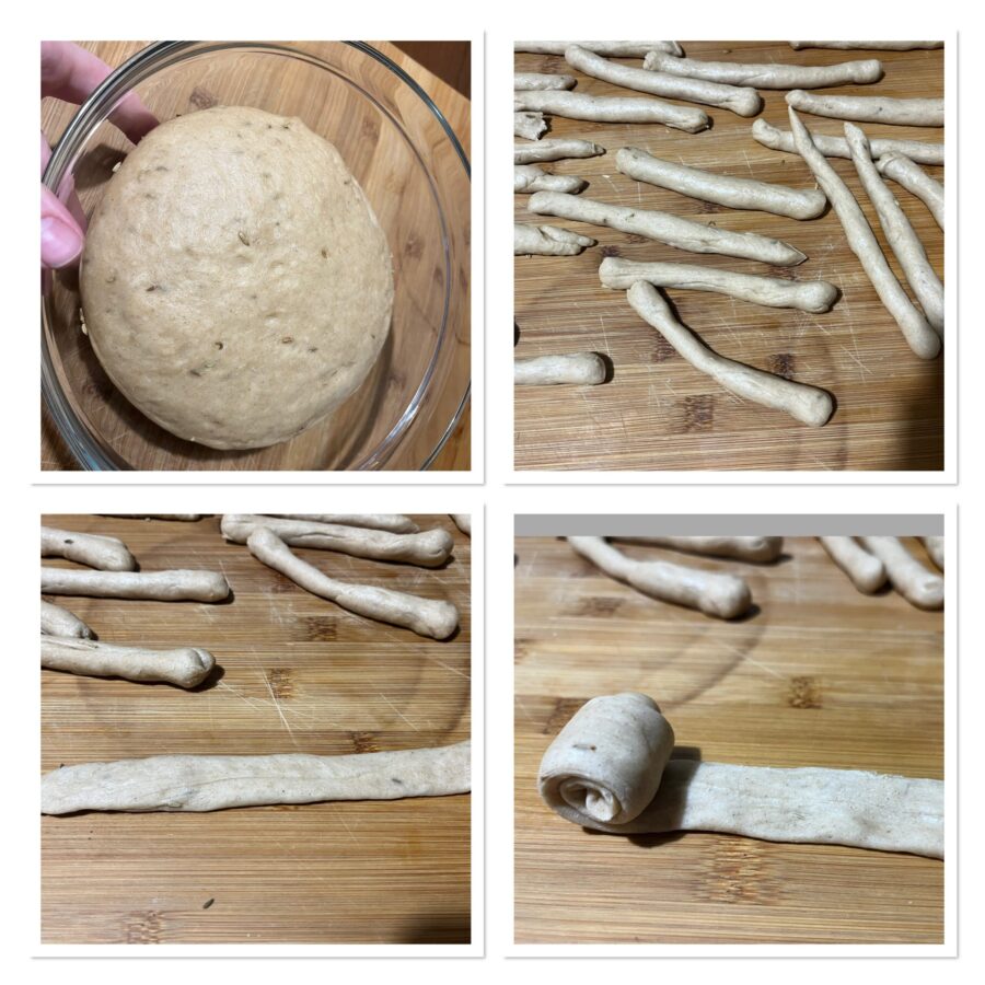 • Divisez la pâte levée en morceaux de 35-40 g et formez des boudins d’environ 20 cm de long, aplatissez les boudins puis enroulez-les sur eux-mêmes ou autour d’un doigt, en formant de petites escargots.