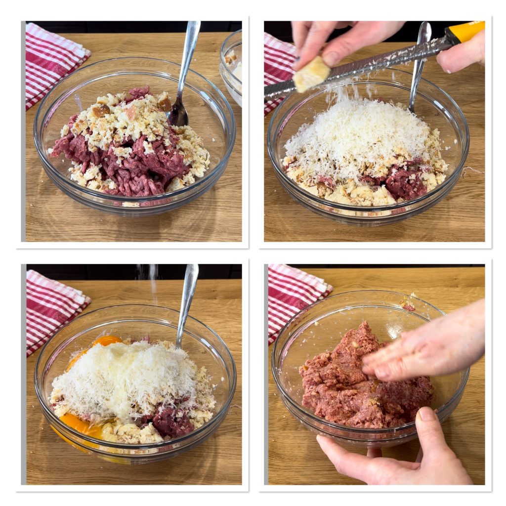 Ajoutez le pain mou et essoré à la viande hachée et incorporez les œufs, le fromage râpé et le sel. Mélangez la préparation jusqu’à obtenir une pâte homogène.