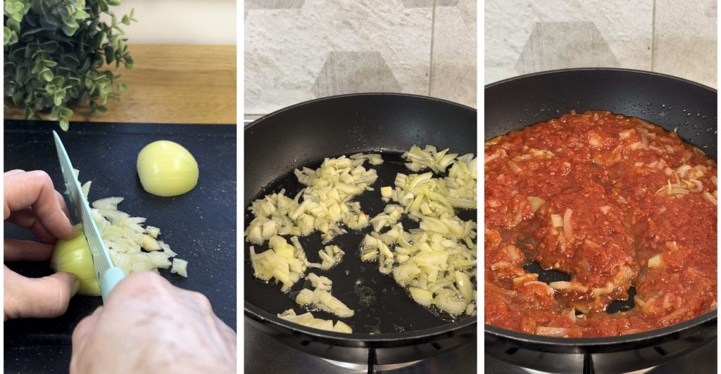 Dans la même poêle, faites revenir et faire tomber l’oignon pelé et émincé. Ajoutez la passata de tomate, rectifiez le sel et laissez cuire à feu moyen pendant 10 minutes.
