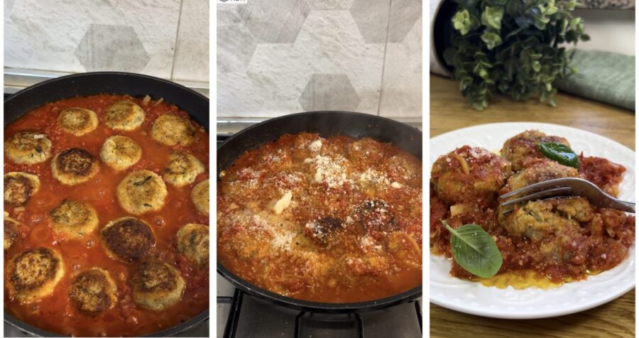 Déposez les boulettes d’aubergines et de pommes de terre et ajoutez un demi-verre d’eau si nécessaire, faites cuire 15 minutes en les retournant à mi-cuisson. Éteignez le feu et laissez reposer 10 minutes. Servez avec une pincée de fromage râpé, du basilic et la sauce de cuisson.