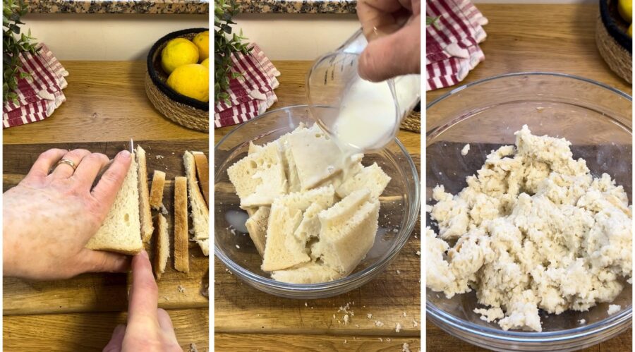 • Retirez la croûte du pain et coupez-le en morceaux. Mettez-les dans un bol et imbibez-les de lait, laissez reposer quelques minutes et une fois bien trempé, émiettez-le.