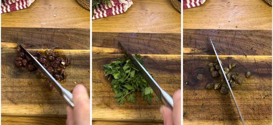 • Rassemblez dans le même bol le pain, le thon égoutté, les œufs, le fromage râpé, le poivre, le zeste de citron, les câpres, les olives et le persil. Pétrissez jusqu’à obtenir une préparation homogène.