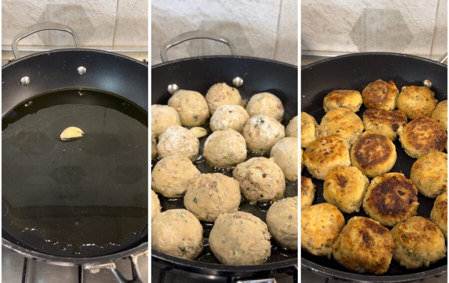 • Faites revenir une gousse d’ail dans un généreux filet d’huile. Ajoutez les boulettes et laissez-les dorer d’abord d’un côté puis de l’autre.