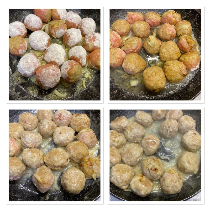 • Ajoutez les boulettes et laissez-les dorer, versez le vin et faites-le flamber à feu vif pour le déglacer.