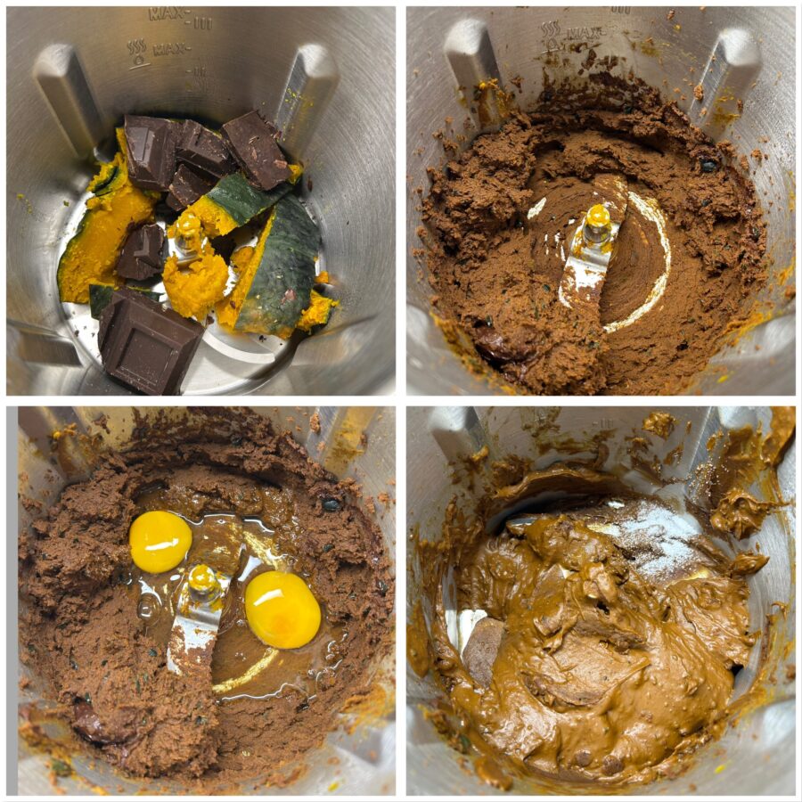 Rassemblez la courge encore chaude dans le bol du mixeur avec le chocolat et commencez à mixer doucement, de manière à ce que le chocolat fonde sous la chaleur de la courge. En alternative, faites fondre le chocolat au bain-marie au préalable pour éviter d’endommager les lames ou le mécanisme du mixeur. Une fois le chocolat fondu, mixez jusqu’à obtenir un mélange homogène. Ajoutez ensuite les oeufs et la levure,
