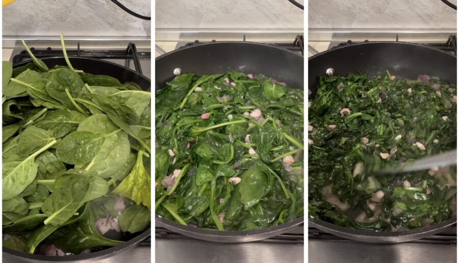 • Épluchez et hachez l’oignon, puis faites-le revenir dans l’huile d’olive jusqu’à ce qu’il dore. Ajoutez la pancetta, laissez cuire une minute et incorporez les épinards nettoyés, rincés et égouttés (j’utilise ceux en sachet déjà prêts pour la cuisson).