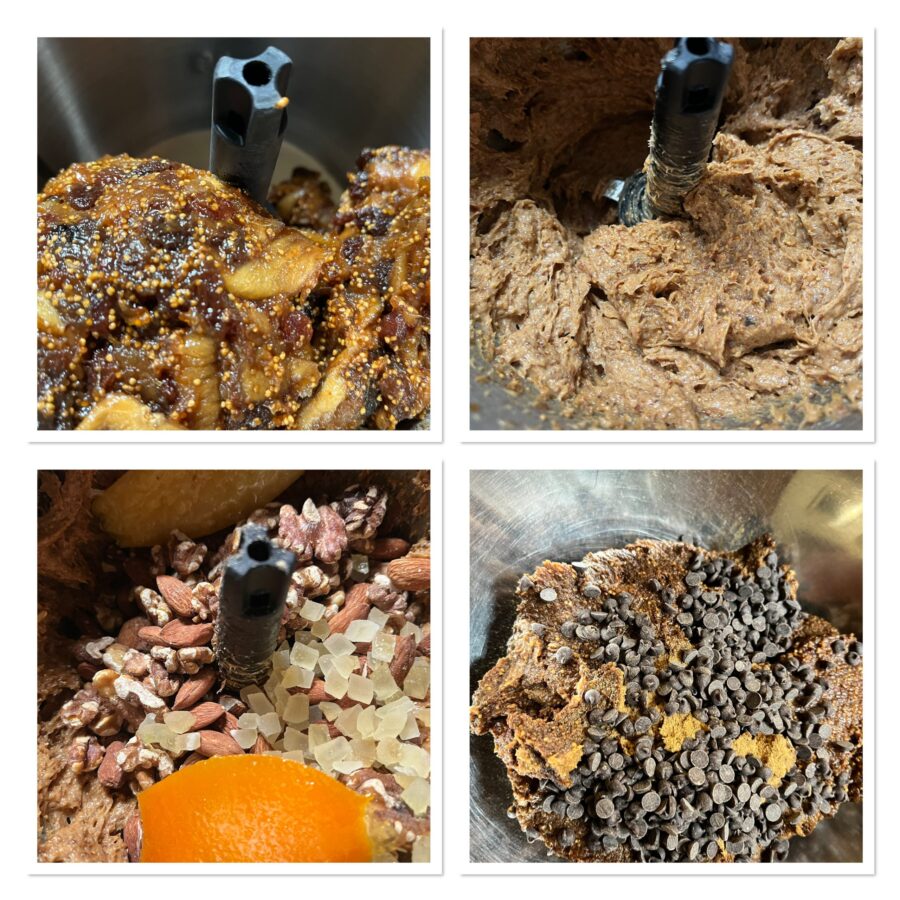 Ajoutez les fruits secs torréfiés, la zuccata, le zeste d’orange confit, les clous de girofle en poudre, la cannelle et le cacao, puis mixez à nouveau.