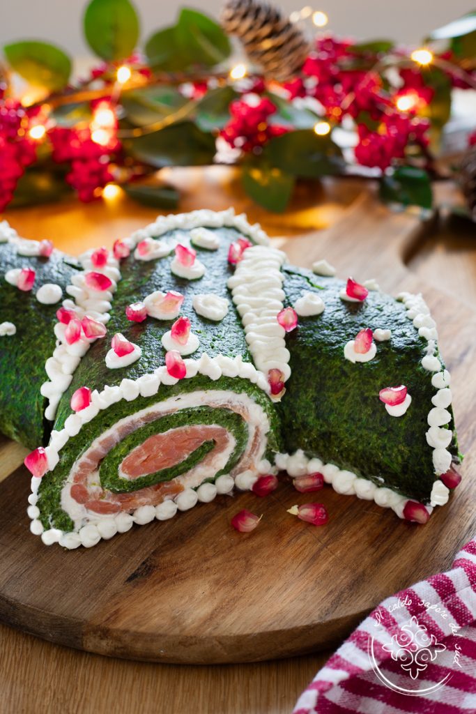 Bûche de Noël omelette, salée et sans gluten au saumon, préparée sans pain de mie. La bûche de Noël salée est une entrée gourmande et spectaculaire, la version salée de la bûche de Noël sucrée, on peut la décliner de mille façons et elle apporte sur la table des fêtes du goût et de la gaieté ! La bûche de Noël est un roulé salé garni que l’on peut faire sans cuisson comme le roulé salé au thon et saumon, ou bien cuit pour une délicieuse recette sans gluten, comme celle que nous préparons aujourd’hui. La base de notre bûche sera en effet une délicieuse omelette aux épinards cuite au four, verte comme l’une des couleurs de Noël, garnie de robiola parfumée au citron et de saumon et roulée comme une bûche salée traditionnelle. Si donc vous cherchez des recettes sans gluten pour Noël et le Nouvel An, la recette de cette entrée sans gluten super facile, spectaculaire et gourmande, je suis sûre qu’elle pourra vous aider ! Allons en cuisine maintenant, découvrons ensemble comment faire : la bûche salée au saumon avec roulé d’omelette va vous faire craquer, mais avant de courir aux fourneaux je vous rappelle que si vous voulez rester informés des nouvelles recettes vous pouvez suivre ma page Facebook et mon profil Instagram.