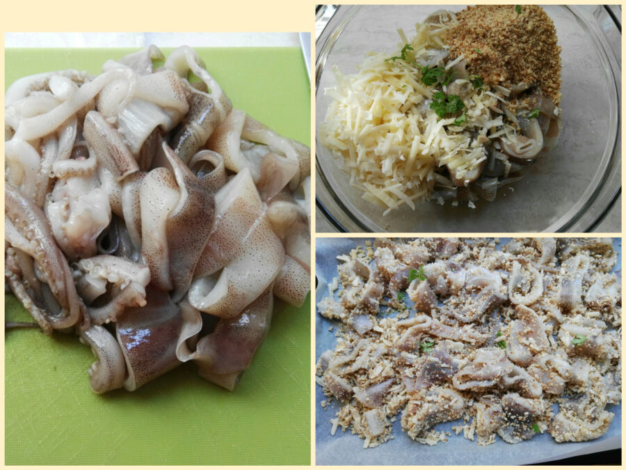 Placez les calamars coupés dans un bol et assaisonnez-les d’un généreux filet d’huile d’olive extra vierge, de la chapelure, d’une pincée de sel, du Grana Padano râpé ou du parmesan, du persil haché, une pointe d’ail, du poivre noir et le jus d’un demi-citron. Mélangez bien, afin que la chapelure adhère parfaitement aux calamars.