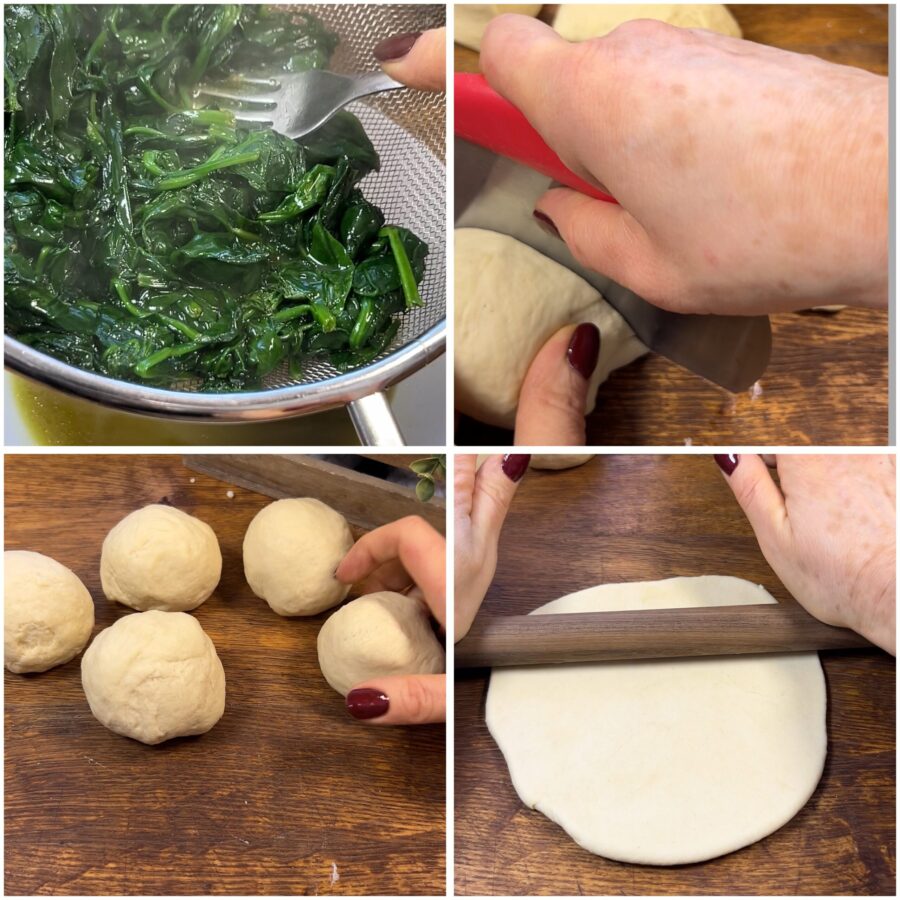 Égouttez et essorez les épinards pour éliminer l’excès d’eau et divisez la pâte en 5 morceaux, en formant des boules.