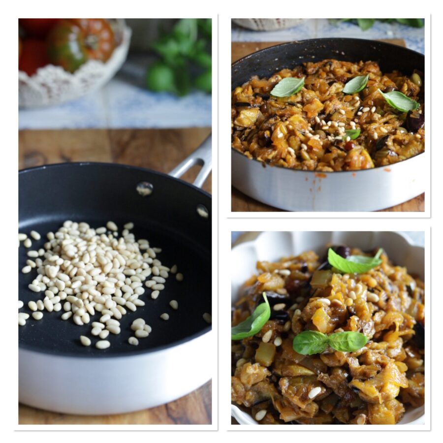Faites légèrement griller les pignons dans une poêle, sans les brûler, afin qu’ils deviennent plus aromatiques. Ajoutez-les à la caponata, faites revenir le tout 5 minutes à feu vif (vous pouvez ajouter un peu d’eau si le mélange vous semble trop sec) et la caponata est prête.